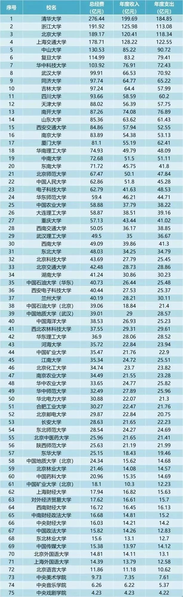 75所高校中有三所高校决算数字未超过10亿,分别为