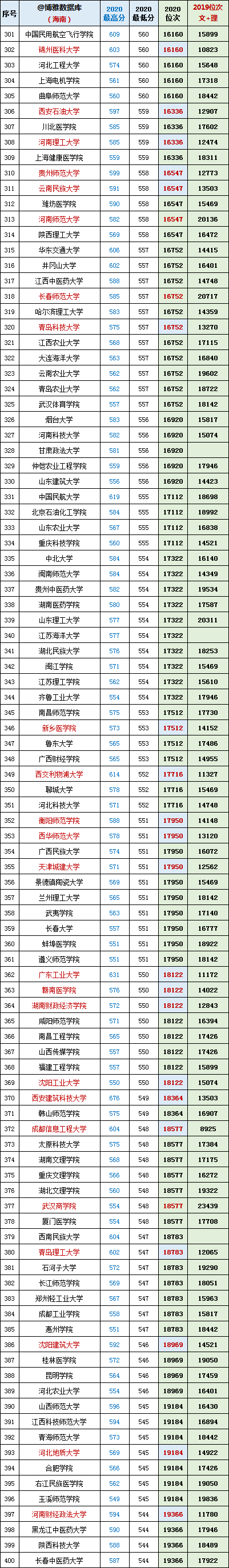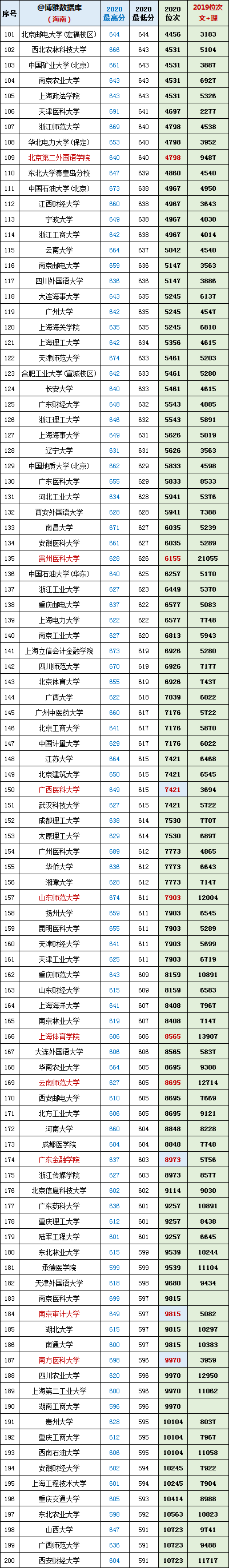 "2020最低分":指最低专业组的投档分。包含另一代码、中外合作专业,对高校的中外合作专业组、普通专业组进行了合并。"2020位次",最低录取位次,最低专业组的投档分(进入一所高校的门槛分)对应的位次(一分一段表中累计人数)。"2019 位次 文+理":2019年高校文科、理科投档分对应的位次之和。![]()