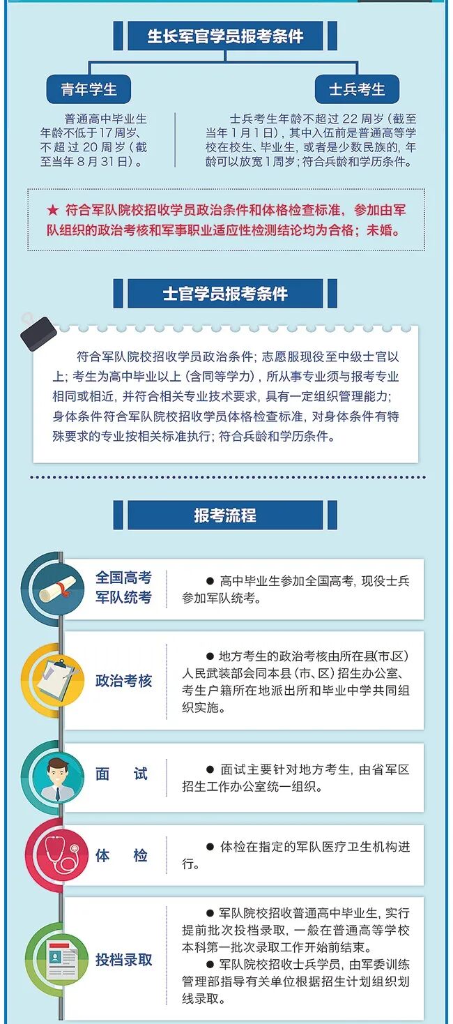 解读:考生除了满足基本条件外,还需通过军队组织的政治考核及面试、体检,结论合格后才能报考军校。