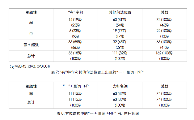 表7显示,同样的“一 + 量词 +NP”形式,用“有”字句引进时,该事物的主题性要高于在其他句法位置上引进的成分。
