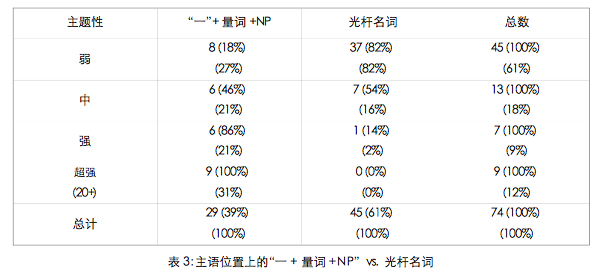 接着看表3(见下页),展示的是首次以两种语言形式在主语位置上引进的事物,在主题性上有什么特点。