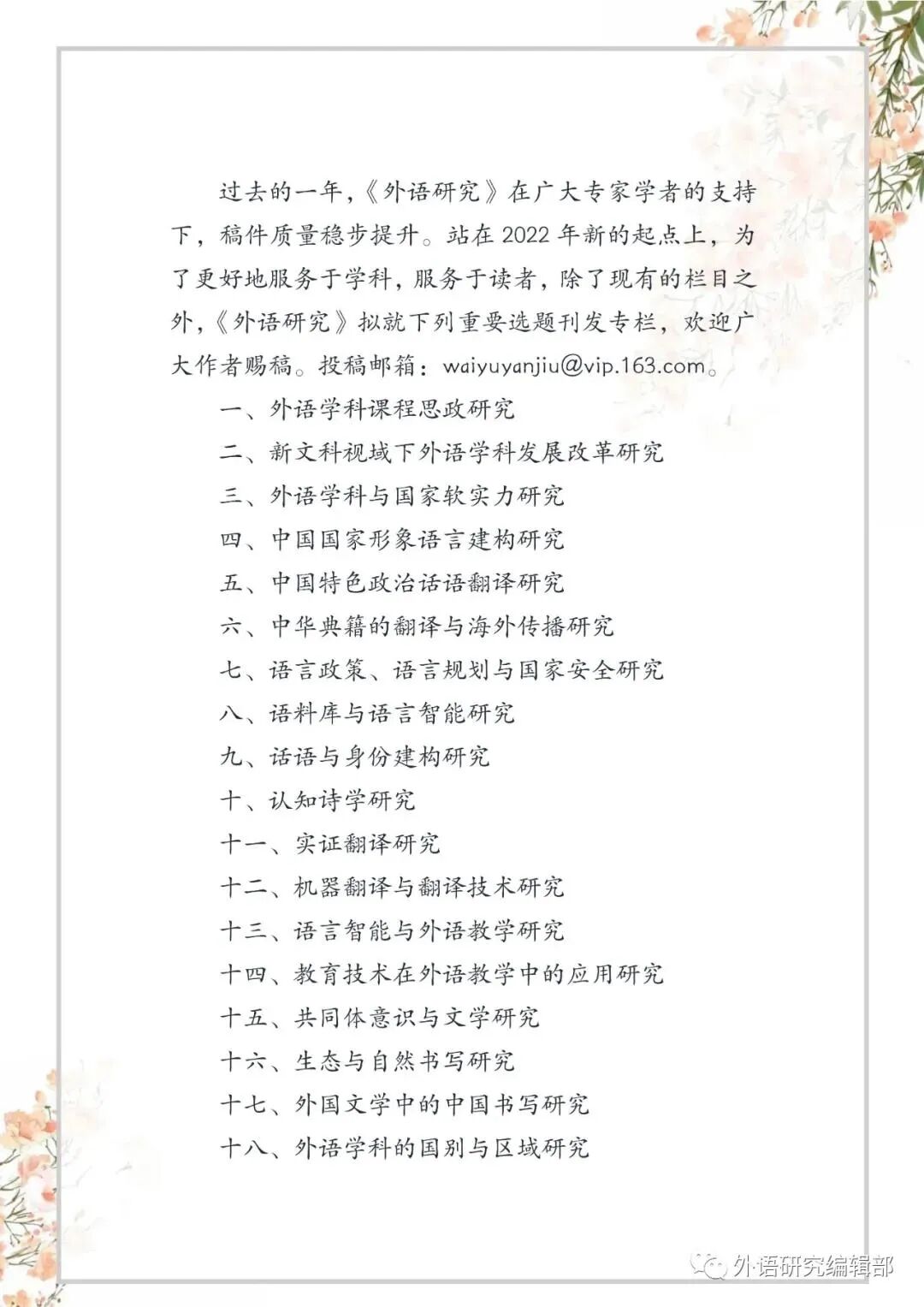 为深入探讨我国外语教育改革发展的现状与面临的挑战,以科学研究推动教学理念与方法的创新,服务国家发展与人才培养,《外语教育研究前沿》除常设栏目外,2022—2023年选题将侧重如下方向,诚挚欢迎全国外语教育研究者不吝赐稿。