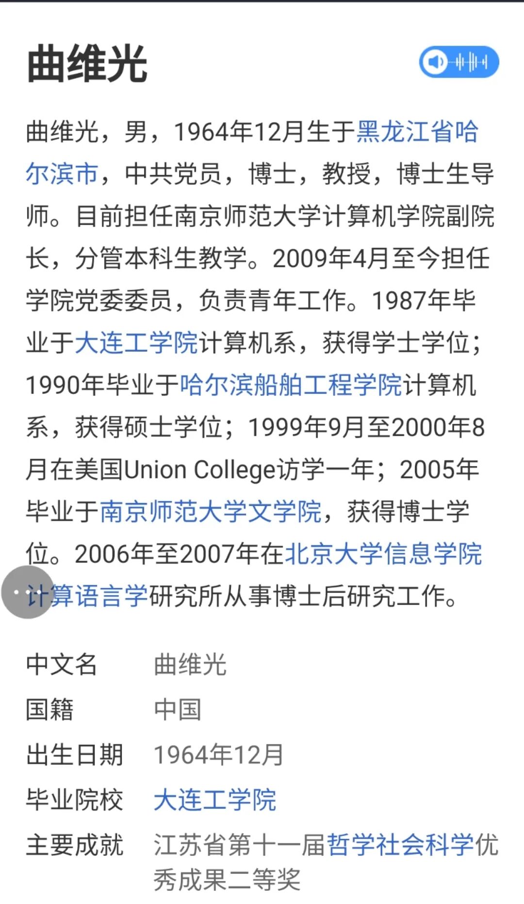 有意思的是上图博士导师曲维光是南师大计算机科学学院的副院长,所以“计算语言学”方向应该是计算机学院和文学院联合培养吧。