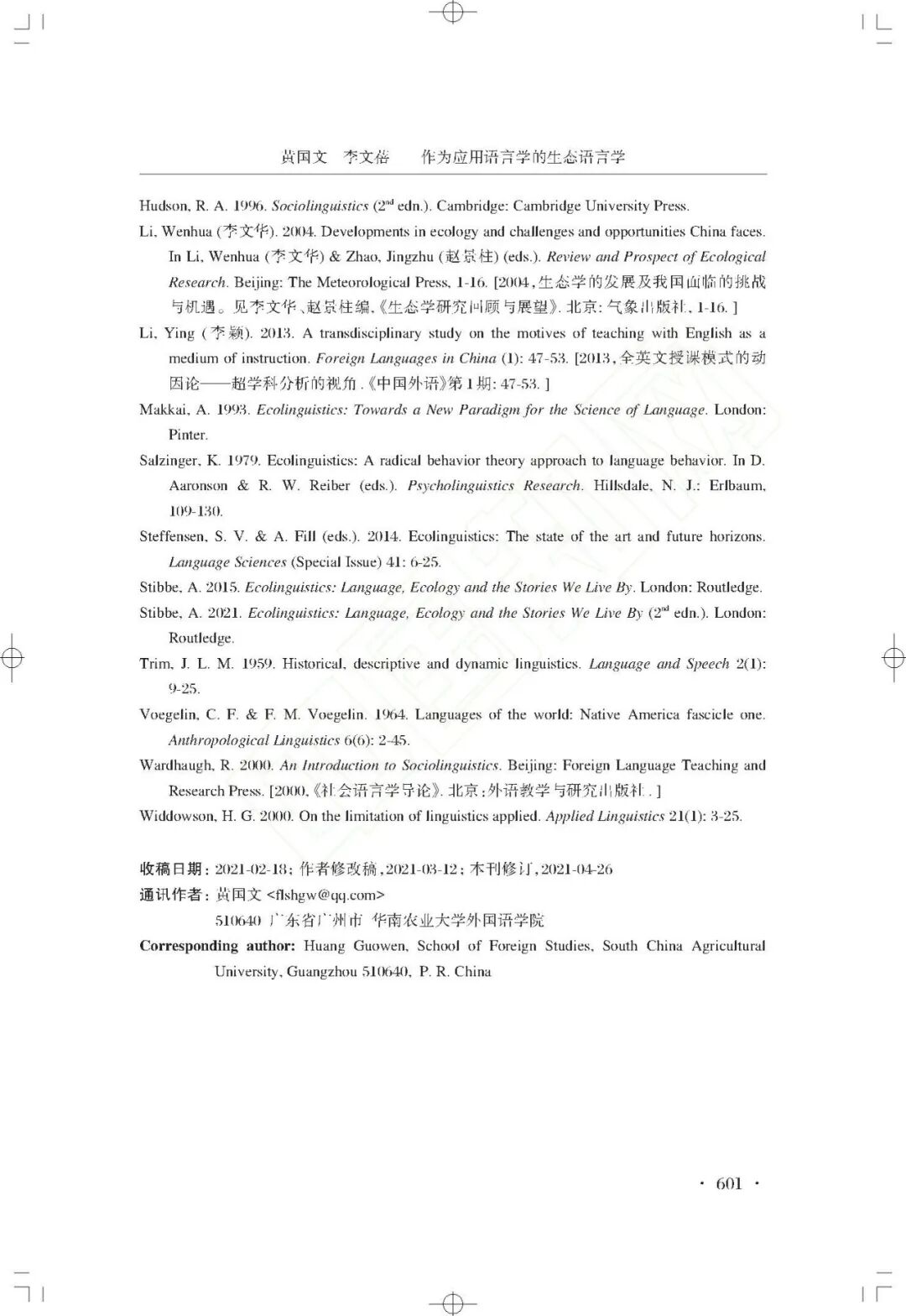[引用格式] 黄国文,李文蓓.作为应用语言学的生态语言学[J/OL].现代外语:1-10[2021-06-10].http://kns.cnki.net/kcms/detail/44.1165.H.20210604.1746.026.html.