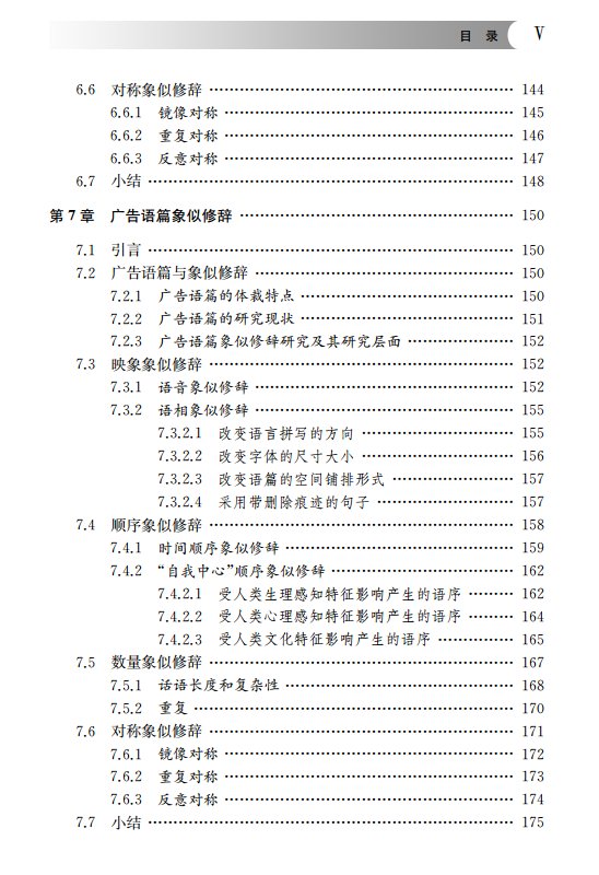 第4至8章分体裁对各种语篇的象似修辞进行探究,具体包括文学语篇象似修辞研究(上、下)、演讲语篇象似修辞研究、广告语篇象似修辞研究以及商标语篇象似修辞研究,分别探讨象似修辞在各个体裁中的运用特点、规律和作用。其中,第4、5两章分别从语音、语相、顺序、数量、对称和被动等六个层面细致分析象似修辞在文学创作中所具有的重要作用。由此可见,文学语篇中象似修辞运用比较普遍。相比而言,出现在其他非文学语篇中的象似修辞类型则少得多:第6章的演讲语篇象似修辞涉及语音、顺序、数量和对称四种象似修辞,第7章的广告语篇象似修辞涉及映象(含语音和语相)、顺序、数量和对称四种象似修辞,而第8章的商标语篇象似修辞则仅涉及映象、拟象和隐喻三种象似修辞。