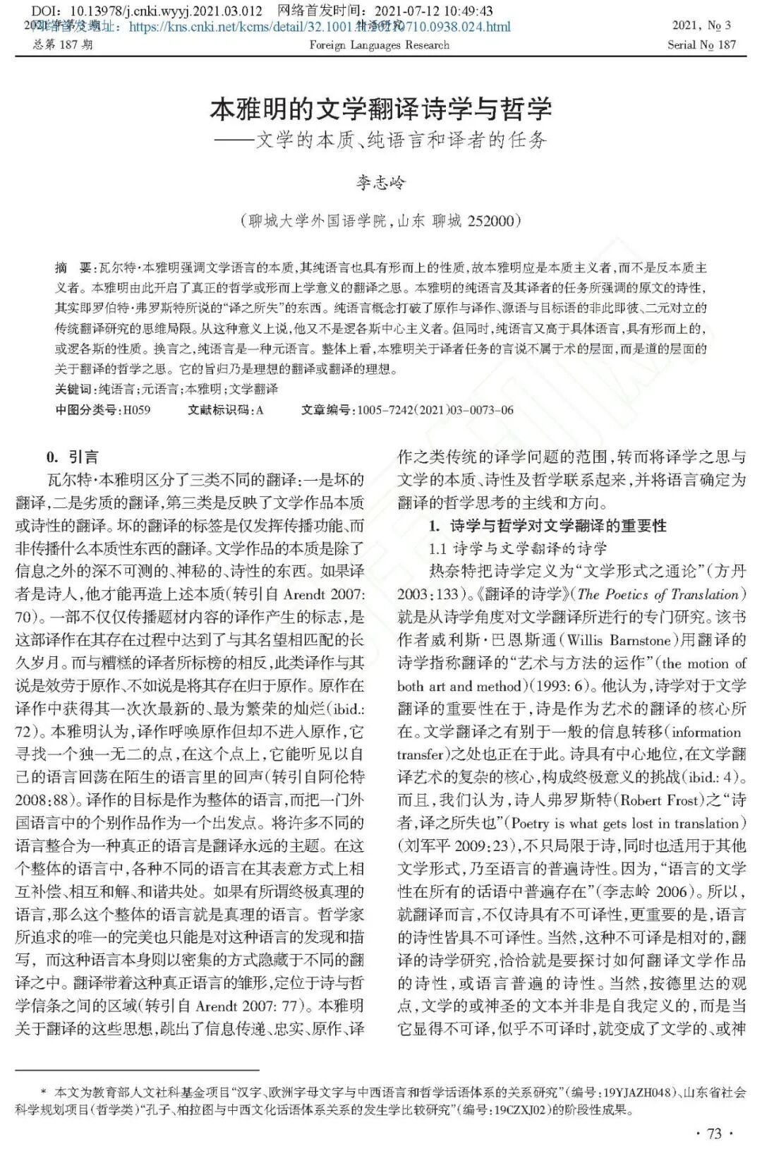 [引用格式] 李志岭.本雅明的文学翻译诗学与哲学——文学的本质、纯语言和译者的任务[J/OL].外语研究,2021,{4}(03):73-78[2021-07-13]. https://doi.org/10.13978/j.cnki.wyyj.2021.03.012.
