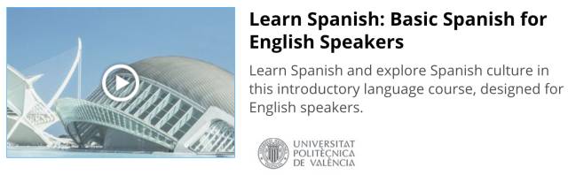 经常上网课的筒子们肯定对edX这个平台很熟悉,他家较多提供的是美国大学的课程,在他家你既可以找到免费课程也可以找到付费课程,一般付费课程可以拿到证书。这门初级西班牙语课程是西班牙巴伦西亚理工大学(UPV)提供的自主控制学习进度的网课。这门课时长16周,每周需要耗时4小时,主要教授最为基本的西班牙语会话技巧、语音以及一些简单的语法。如果有需要还可以话费40美刀申请证书。