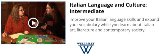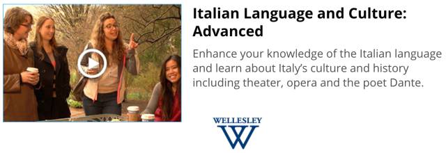 这三门意大利语课是由美国卫斯理学院提供的,每个阶段都需八周,每周需要花3-4个小时。在入门阶段,学生将会学习基本会话技能、简单的语法以及一些意大利文化常识。到了中级阶段,学生的会话技能将会有一定提升,意大利语读写也将被引入课程,老师会在初级课的基础上继续添加重点语法结构,另外,学生也将更深入地了解像文学、时尚、饮食等更深层次的意大利文化。高级课程则会在前两门课的基础上引入报刊阅读以及意大利社会经济文化概况。有需要的同学可以花费49美刀/门申请证书。