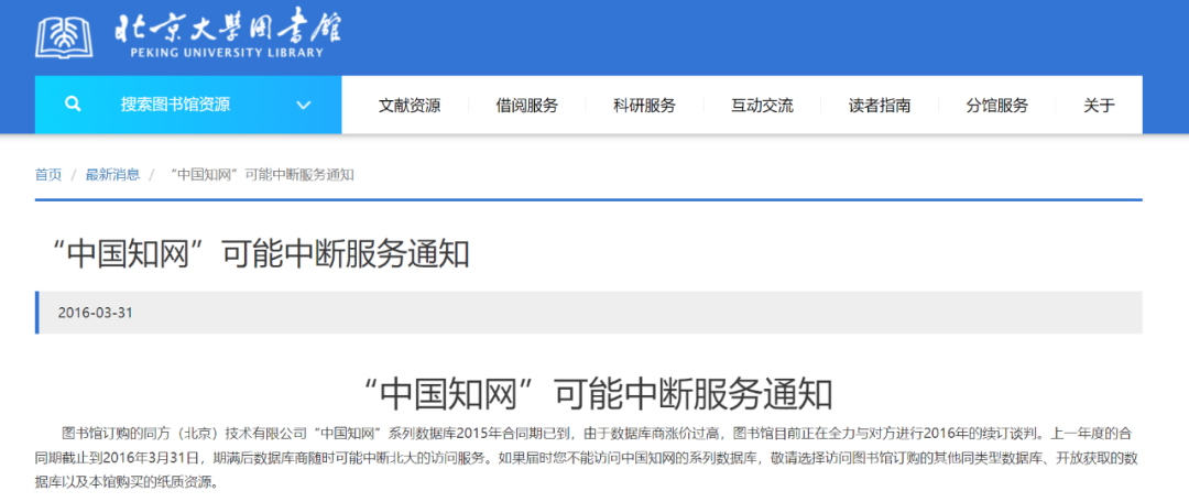 2016年,北京大学图书馆官网曾贴出即将停用知网的通知。