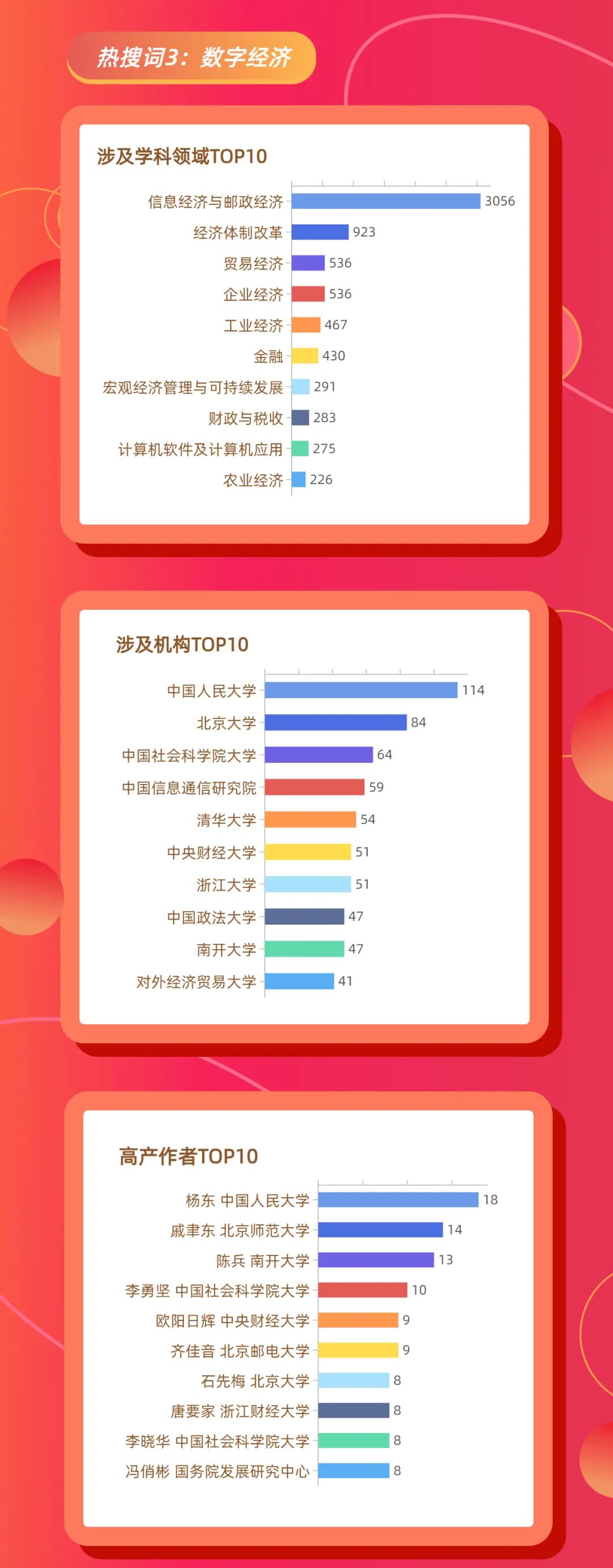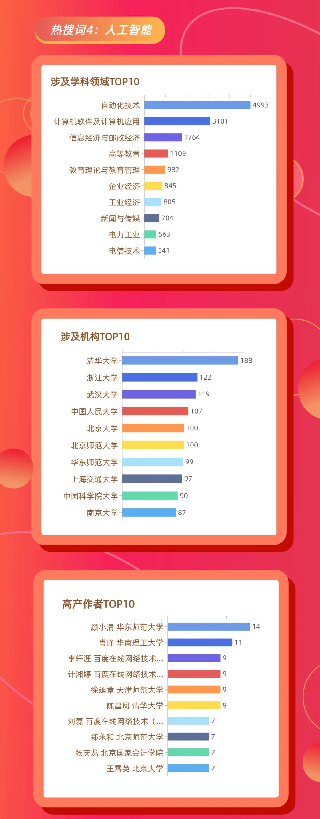 本文以中国知网2021年文献大数据为基础,统计得出了2021年知网全网热搜词TOP10、各热搜词检索次数及相关学术论文篇数,进而根据论文产出数量统计得出了各热搜词相关论文产出机构TOP10、学科领域TOP10、作者TOP10。现予公布,以飨读者。