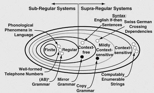 图2:语言可以依据不同的复杂程度进行分级,并可大致分为正则下(左向箭头)和超正则(右向箭头)两种系统。
