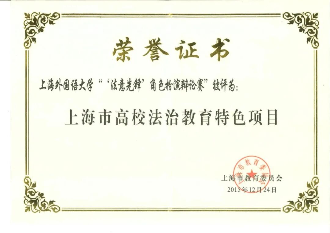 其中,“模拟法庭大赛”被评为上海市高校法治教育特色精品项目,“法意先锋角色扮演辩论赛”被评为上海市高校法治教育特色项目,“法律援助志愿者青年团队”获评“上海市青年五四奖章集体”称号。