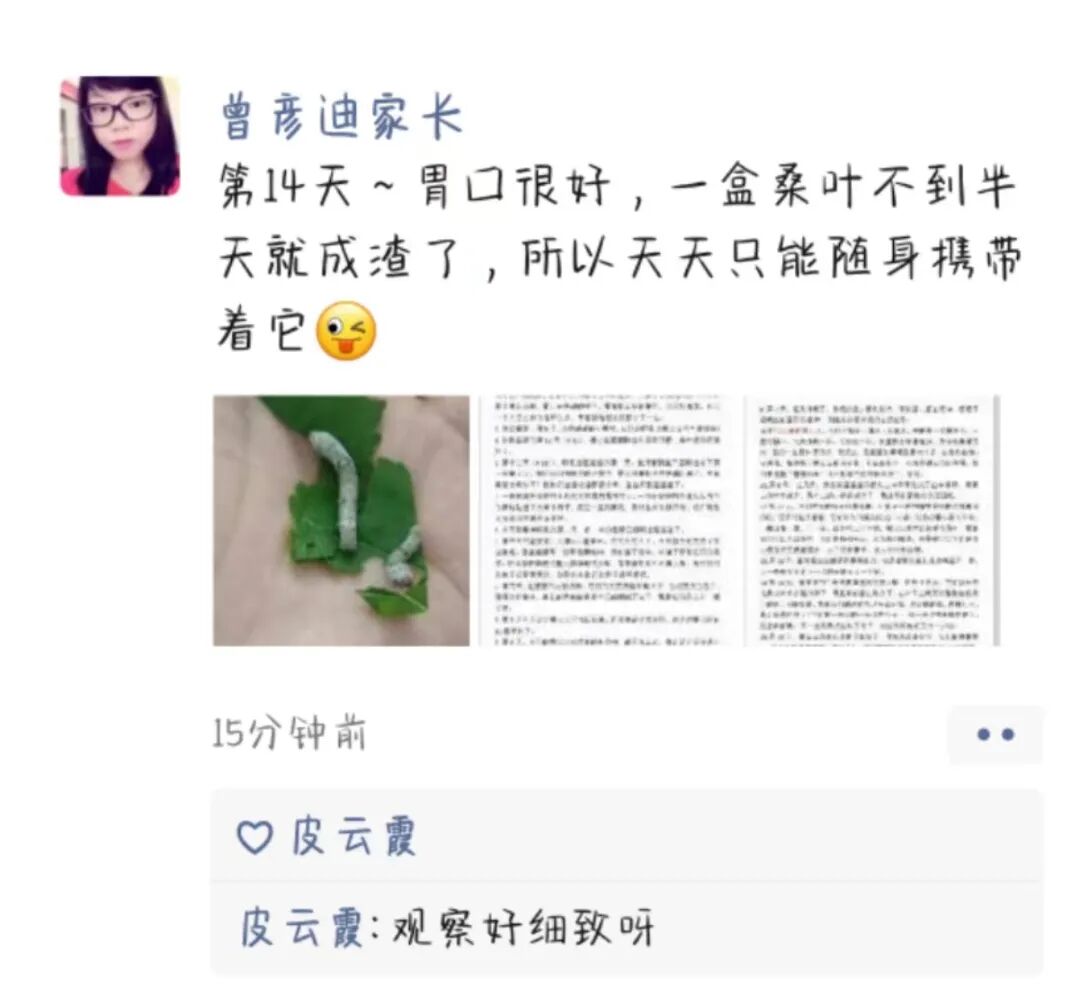 蚕宝宝的到来让孩子们多了一份爱心和责任心,将学到的科学知识运用到实践中,采桑、喂养、观察,记录,用劳动去成就一个个鲜活的生命。蚕宝宝幸福的躺在绿绿的叶子中,我们和它们的故事也将继续······