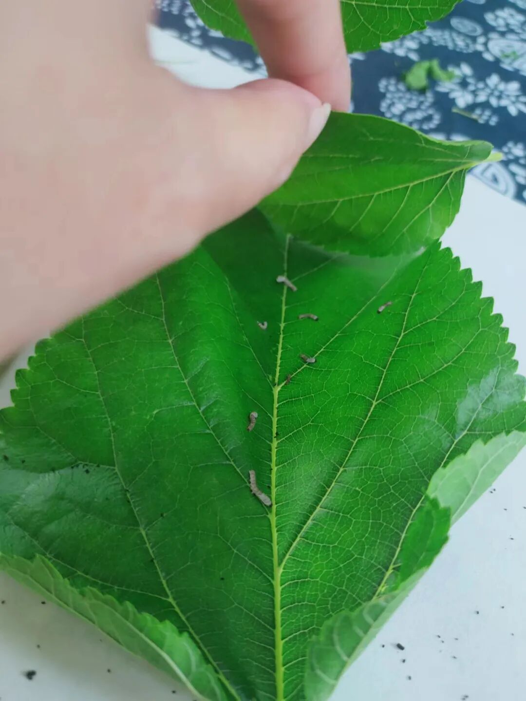 老师讲过,刚刚孵化的蚕宝宝要吃嫩嫩的桑叶,而且还要给它剪碎哦。看,我刚刚放的桑叶上面吸引了好多蚕宝宝过来呀,它们是不是能闻到味道呀?太聪明了吧!