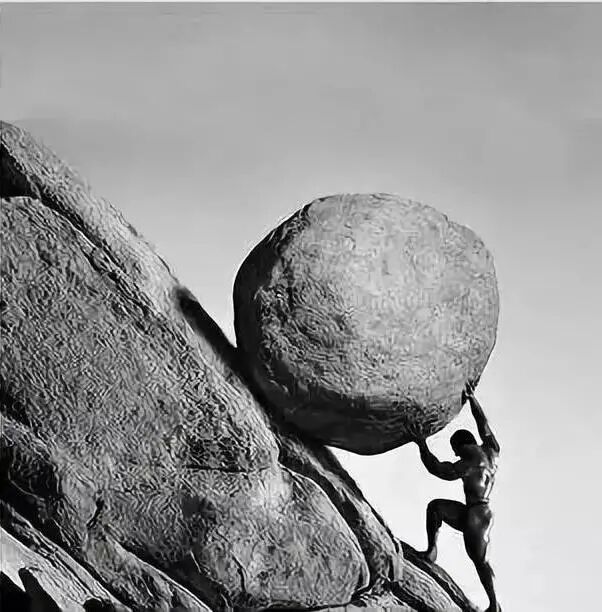 他们不停地把一块巨石推上山顶,而石头由于自身的重量又滚下山去。