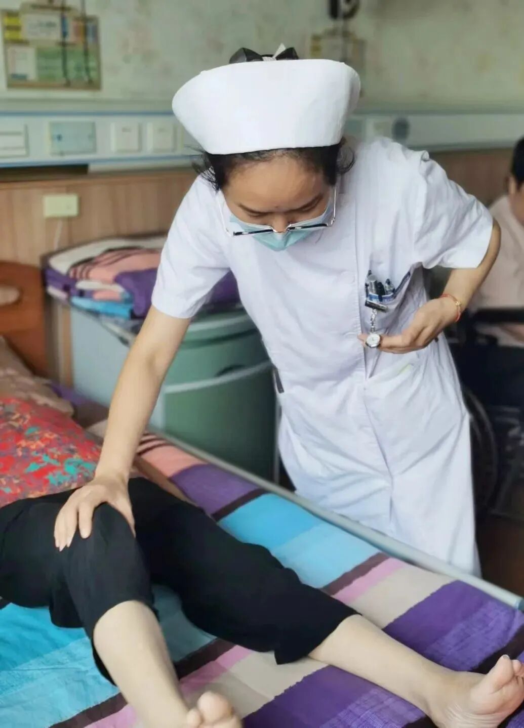 除了医疗和护理,宁大附院还推出了床边康复课堂,一边指导卧床老人做康复,帮助老人提高生活质量,一边为疗养院的护士和护理员进行培训。