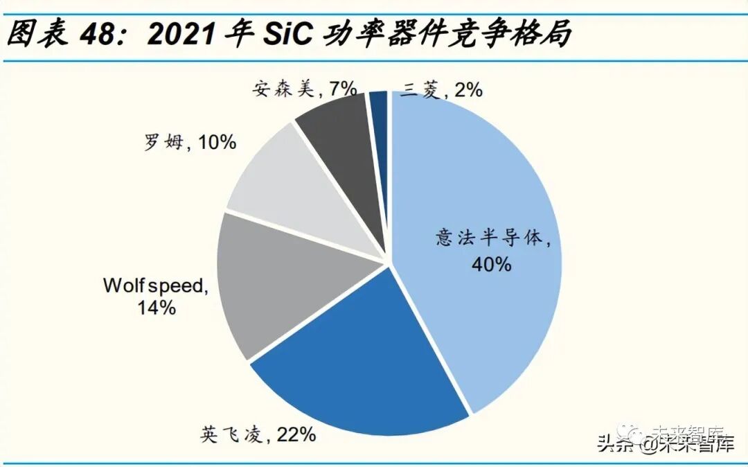 SiC 行业壁垒更高,竞争格局更优,国内企业积极布局。1)SIC 行业研发 周期长、制造难度高、资金投入高。①产业链涵盖衬底→外延→设计→制 造→封装,其中衬底、外延、制造、封装占晶片加工成本的 50%、25%、 20%、5%,其中 SiC 单晶生长过程几乎是黑箱操作、难以观测、难度极高。②英飞凌 1992 年开始进行碳化硅材料布局,直至近两年方开始大规模建厂扩产,2022 年 2 月英飞凌宣布将投资 20 亿欧元扩充第三代半导体产能, 预计项目达产贡献增量收入达 20 亿欧元。2)SiC 衬底、外延片集中度最 高,Wolfspeed 市占率达 50%,罗姆、II-VI 市占率达 35%,三家公司长晶 炉均为自己设计。SiC 功率器件的主要玩家包括意法半导体、英飞凌、 Wolfspeed、罗姆、安森美、三菱,2021 年 CR3 达 76%。3)国内企业纷 纷布局 SiC 领域,比亚迪 2020 年是国内唯一实现 SiC 模块在电机驱动控 制器中大批量装车。2022 年时代电气投资 4.6 亿元将现有 4 英寸 SiC 芯片 年 1 万片产能提升至 6 英寸 SiC 芯片年 2.5 万片。2021 年斯达半导募资 5 亿元拟投产年产 6 万片的 6 寸 SiC 芯片,截至 2021 年 9 月斯达半导已获 得 3.4 亿车规级 SiC MOSFET 模块订单。2021年 H1 士兰微 SiC 功率半导 体中试线已成功通线,预计于 2022 年三季度投产。