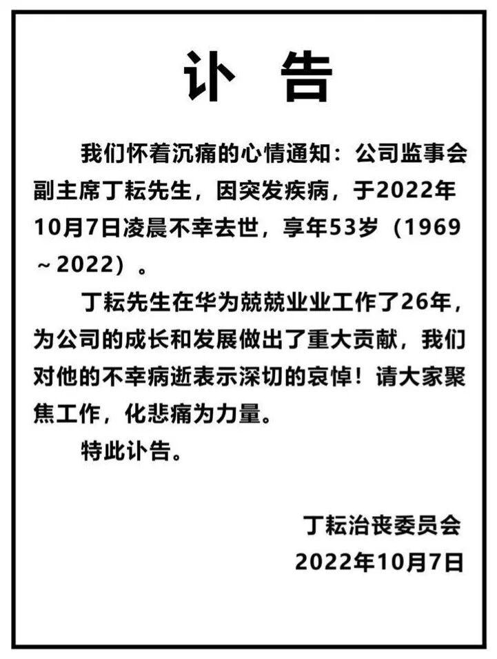 10月7日晚,华为心声社区发讣告称,公司监事会副主席丁耘先生,因突发疾病于10月7日凌晨不幸逝世,享年53岁。