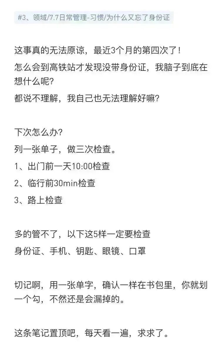我察觉到自己总是丢身份证,于是在身份证上套了个卡套,上面写着“用完请放回钱包!”。