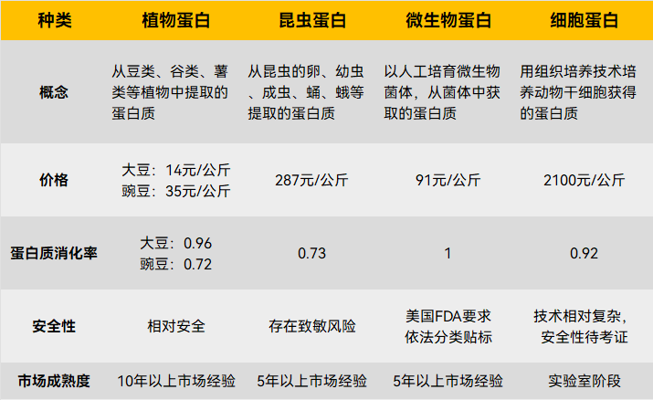 替代蛋白质与肉蛋奶等肉类蛋白质相对,根据原料来源不同,具体可分为四类:植物蛋白、昆虫蛋白、微生物蛋白和细胞蛋白[7]。这些蛋白质在价格、消化率、生产方式和技术成熟度方面各有不同——