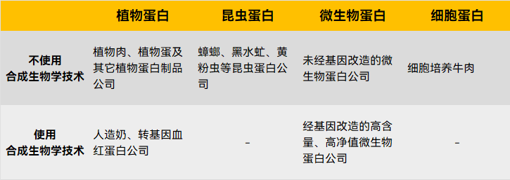除了依据来源进行分类外,还可按生产蛋白质是否使用转基因、基因改造等合成生物学技术,将这四类替代蛋白再度分为两类。