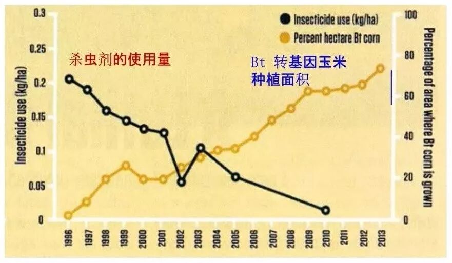 图11.种植转基因玉米能大大减少杀虫剂的使用量(图片来源:Science 2013, 341:731)。