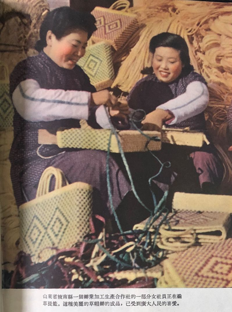 还记得电影里欧美绅士常常戴着夏季礼帽吧?同款草编凉帽也常常是电影里汉奸的标配。这些帽子大部分都出自于我国北方妇女之手。草帽编是中国北方重要的产业,清末期就远销欧美,1910年时出口额达到1300万两白银。[3] 草编的产品也不仅限于草帽,还有包、篮子、筐和其它工艺品。而从事这个产业的主体——北方农村妇女却一直是隐形的群体,《人民画报》在1953年2号中刊登了山东掖南县参与草帽辫的公社女社员的照片。照片中两位女社员微笑着在劳动,面庞红润——或是在拍摄时化了妆,或是照片后期经彩色描绘上色过。
