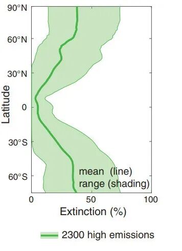 低纬度地区物种灭绝率较低,但物种丰富度相较极地下降得更为显著。低纬度地区原本的生物量更高、生物多样性也更丰富,此外,物种可以向高纬度地区迁徙,有灭绝可能性的物种比例因而不如极地明显和剧烈。但因其本身基数大,且迁徙后本地消亡,净数量上仍然有较大影响。
