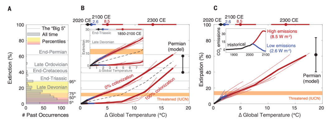 今年4月发表于《科学》杂志的研究中,研究者模拟了二叠纪末期物种灭绝风险与气候变化之间的关系,并得到化石记录数据的验证;研究将该模型迁移到当下环境,量化分析了不同二氧化碳排放情景下,未来全球和局地海洋生物的灭绝风险。