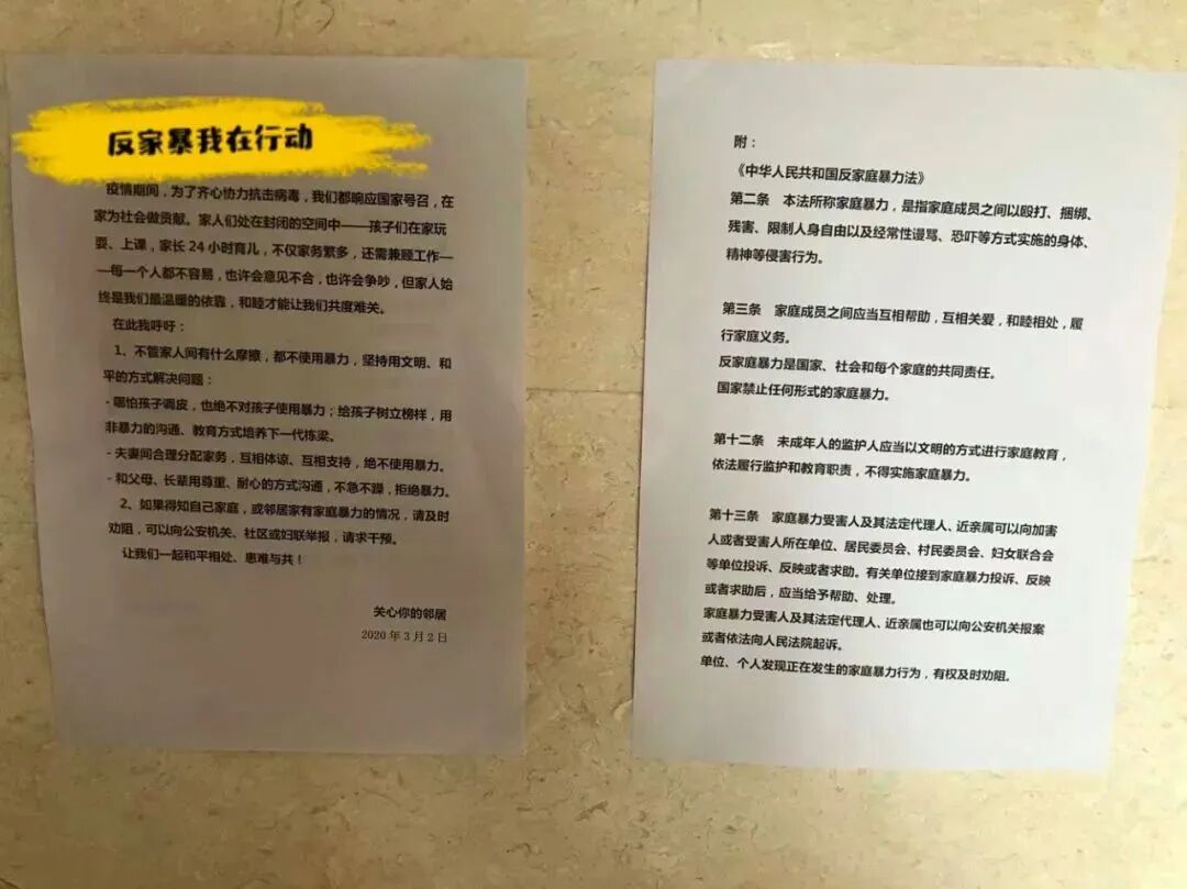 这期间有一些相关的反家暴机构开始活动,反家暴小疫苗就是一个在疫情期间成立的公益组织,号召大家一起通过在生活区域张贴劝告书,来降低疫情期间频发的家暴事件。