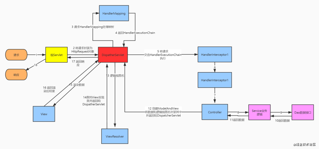 至此,整个Spring MVC的处理流程就算完成了,当然这其中还会有对于国际化的支持,主题的定义与设置等等,但是这些是不常用的,Spring MVC最主要的处理流程所需要的用到的就是以上这些类。可以看到在此过程中,DispatcherServlet起到了至关重要的作用,所以说Spring MVC的核心就在于DispatcherServlet。