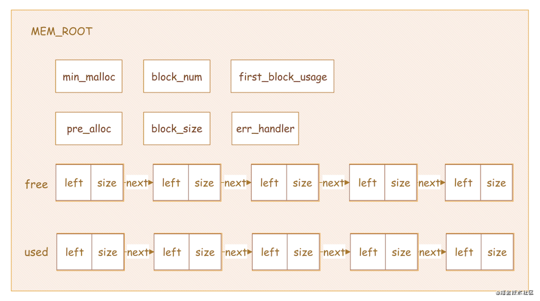 我们先看看MEM_ROOT的结构,MEM_ROOT设计比较简单,主要包含这几部分,如下图: