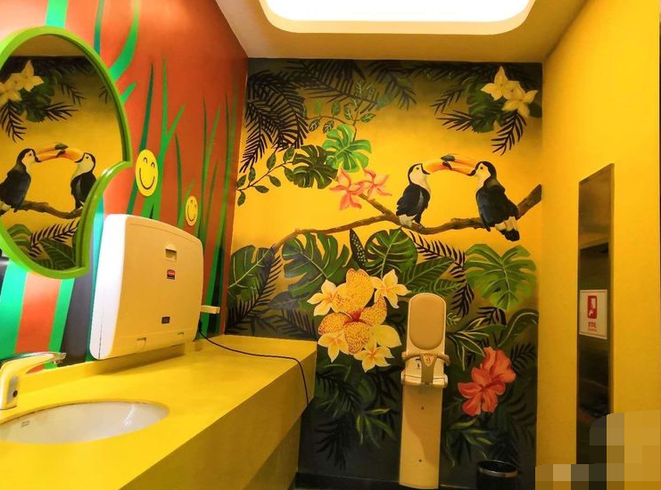于是在设计师的主导下,商场每一间厕所都有不同的壁画主题,各种风格应有尽有。