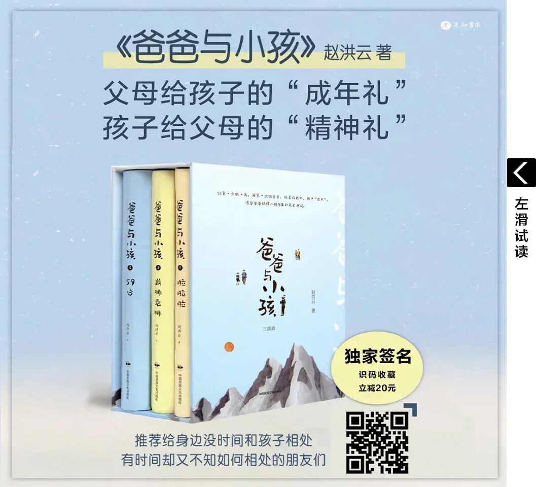 如果说父亲的天职是改造社会,那么,好的家庭教育无疑是改造社会的第一步。今天,卑微但伟大的父亲越来越少,卓越但强势的父亲也越来越少,双向度的亲子关系基本成为常态。但更多的场景是:为此,先知书店诚荐赵洪云老师这套《爸爸与小孩》(3册),这不只是一位平凡但优秀的中国爸爸与小孩一起成长的真实记录,也是值得推荐给想建立一段良好亲子关系,培养孩子人文素养的家庭的一份参考答案。更有作者独家签名,为阅读本书增添一份温情。点击下图,即可一键收藏,赞赏小编原创。