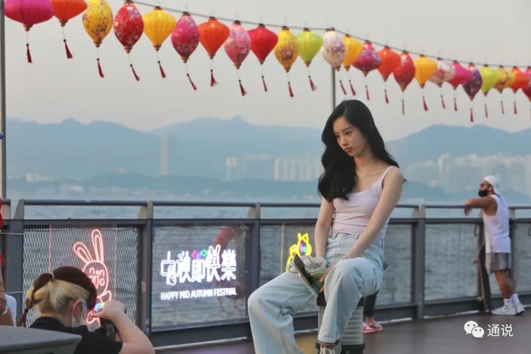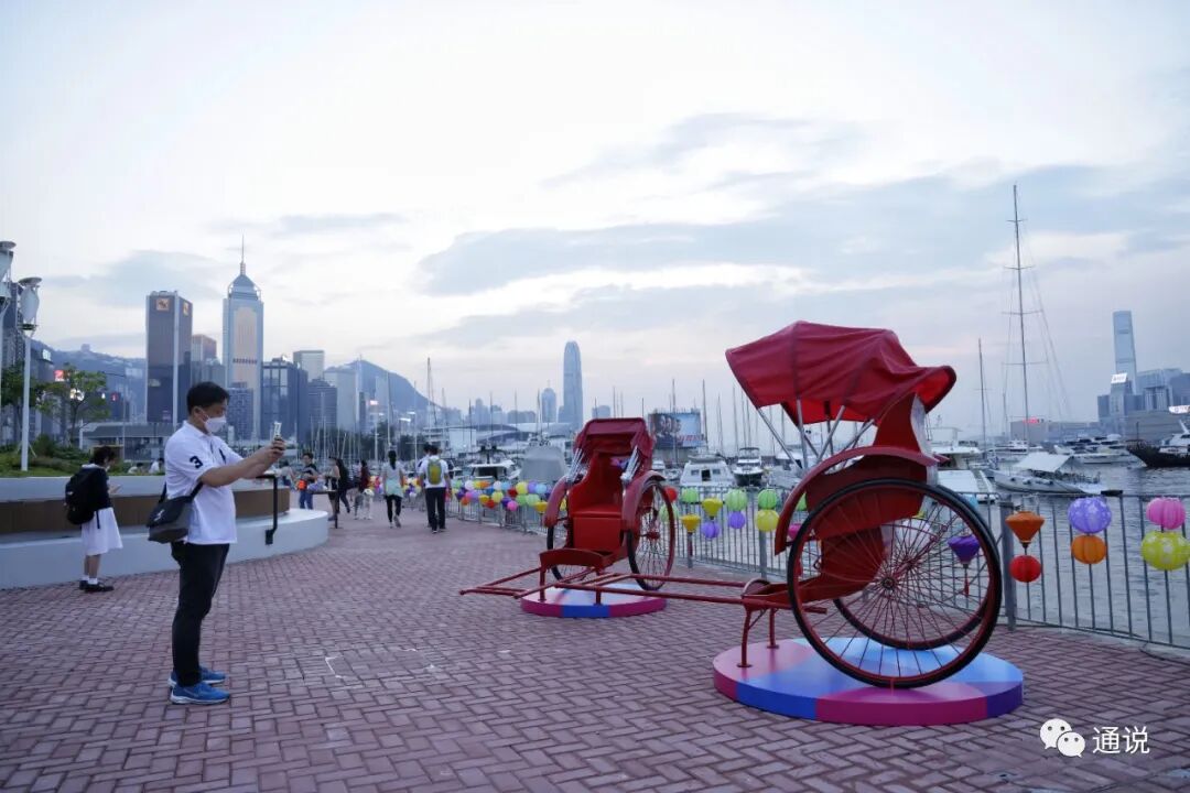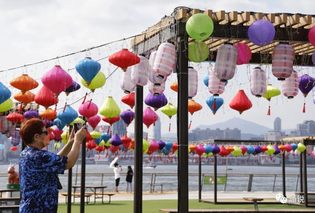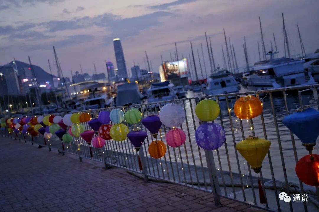 黄昏时份,日落的余光照射大海,映照刚刚亮起的灯笼,画面浪漫唯美,吸引不少香港市民打卡拍照。