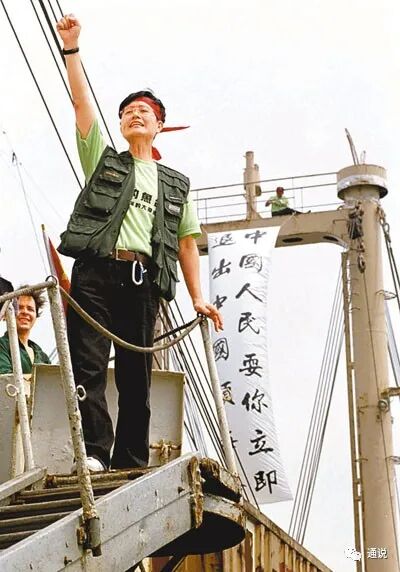 (1996年9月22日,“全球华人保钓大联盟”18名代表出发往钓鱼岛,召集人陈毓祥在标语前呐喊口号。图片来源:香港文汇报)