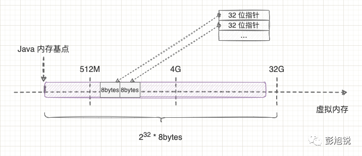 理解了 4G 的计算问题后,再解释 32 位指针如何表示 32G 内存空间就很简单了。 这就拐回到上一节提到的对象 8 字节对齐了。操作系统将 8 个比特位组合成 1 个字节,等于说只需要标记每 8 个位的编号,而 Java 虚拟机在保证对象按 8 字节对齐后,也可以只需要标记每 8 个字节的编号,而不需要标记每个字节的编号。因此,32 位指针其实是表示 ,算起来就是 32G 内存空间了。如下图所示: