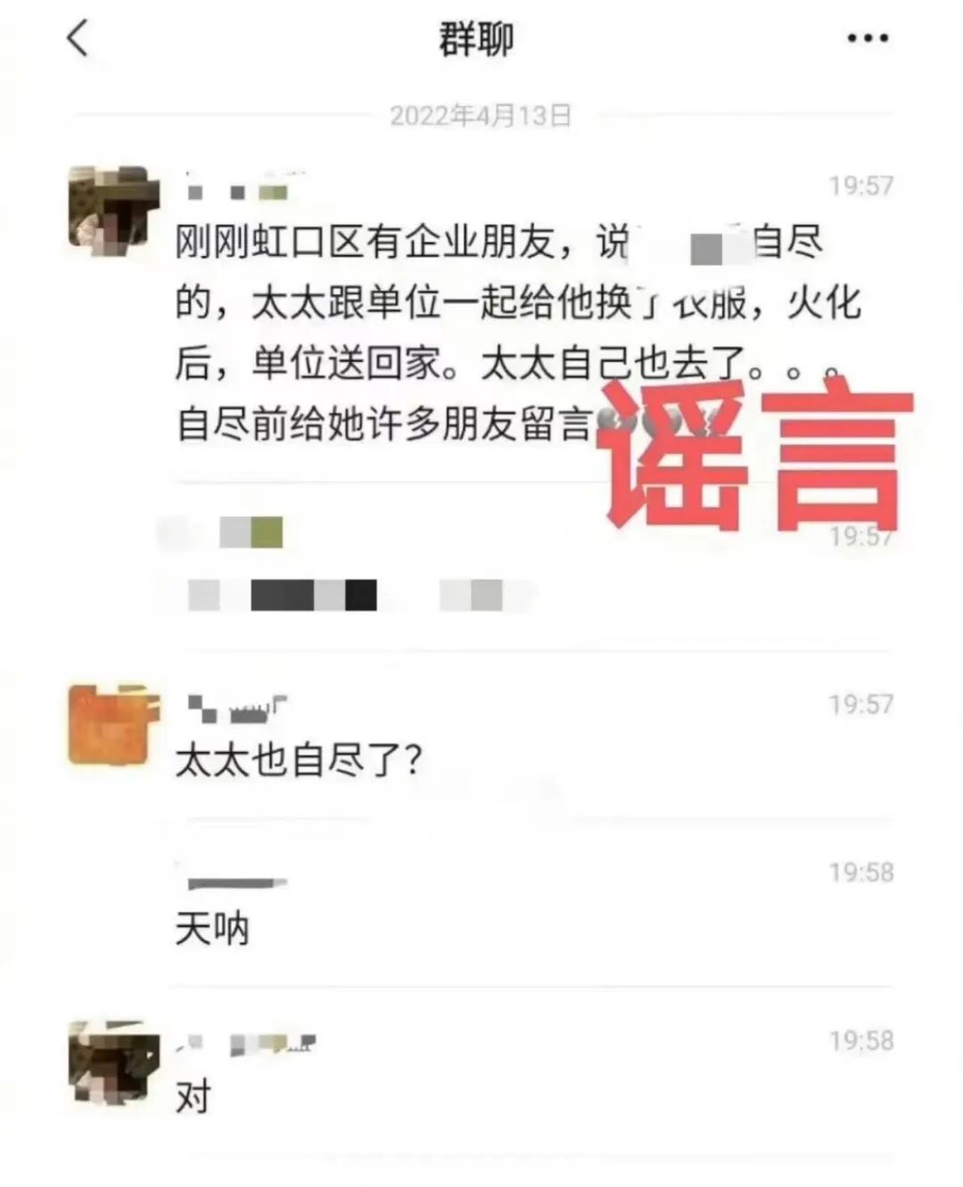 4月14日凌晨,上海有关方面发布微博说,网传信息为谣言,并将某群聊截屏标注粗体红色“谣言“二字。