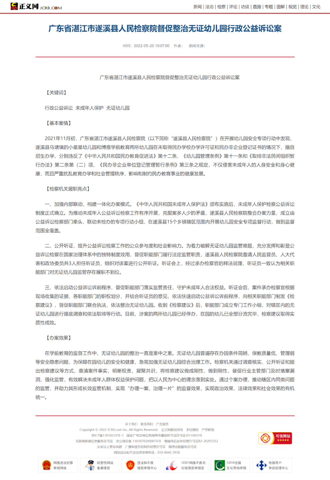 2021年8月至2022年7月,最高人民检察院在全国检察机关部署开展为期一年的“为民办实事 破解老大难”公益诉讼质量提升年专项活动,同步开展“千案展示、百案评析、十案示范”活动。近日,遂溪县人民检察院办理的“督促整治无证幼儿园行政公益诉讼案”成功入选“千案展示”案例,正在正义网平台进行展示。