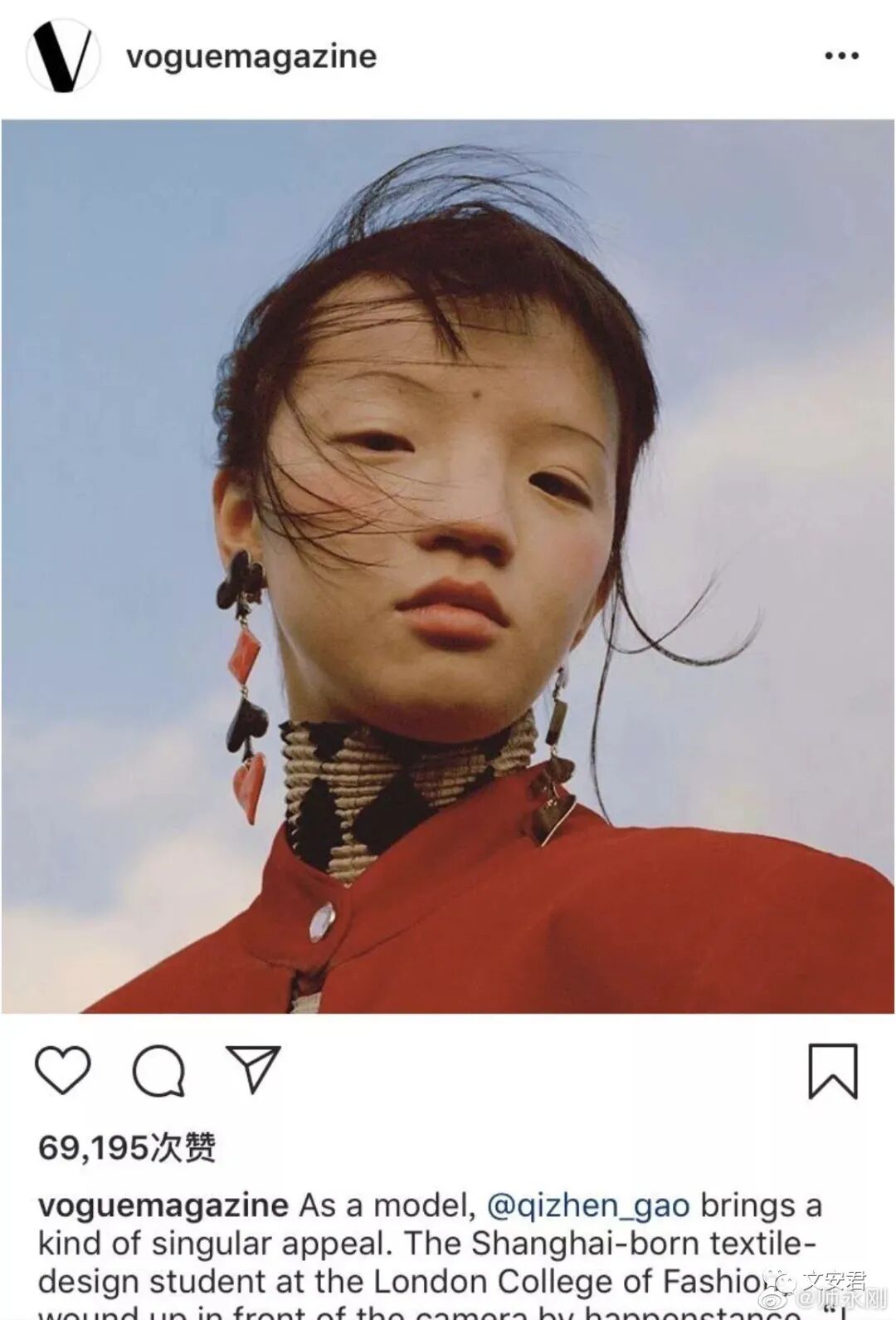 知名时尚杂志VOGUE,在官方INS上,发布了一张中国模特的照片。