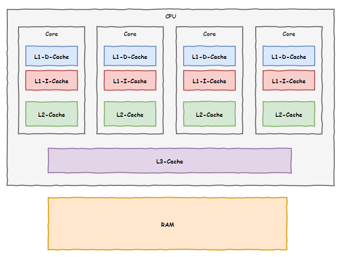 现在,我们用上了三级缓存技术,内存那家伙拖后腿的现象缓解了不少,相当部分时间我们都能从这三级缓存里面找到我们需要的数据。