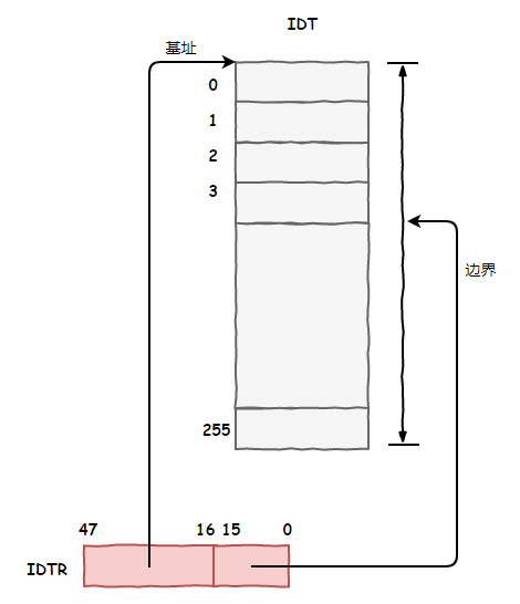 这个表格有点大,足足有256项,咱CPU车间空间有限,放不下,就把它放在内存那家伙那里了,为了能快速找到这个表,专门添置了一个叫idtr的寄存器指向这个表格。