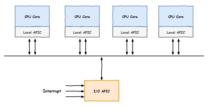 这个APIC的新公司一上台,就成立了两个部门,一个叫I/O APIC,负责接待那些要找我们办事儿的单位,一个叫Local APIC,以外包的形式入驻到我CPU的各个车间工作,因为就挨着我们办公,所以取名叫Local。