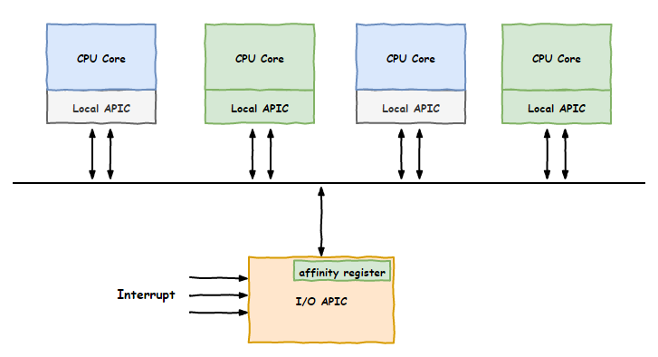 接下来,我们详细讨论了这种方案的可行性,最后大家一致决定,就照这么办,我们一起提出了一个叫中断亲和性的东西,操作系统那边提供一个可配置的入口smp_affinity,可以通过设置各处理器核的掩码来决定中断交由谁来处理,APIC回去负责落地支持。