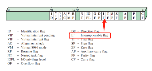 不过有时候我们在执行非常重要的事情的时候,就不想被他们打断。于是我们又在车间里那个eflags寄存器中设置了一个标记,如果是1我们才允许被打断,如果是0那就算天王老子找我们也不管了。