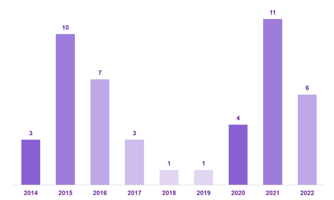 如下图,各年份数据交易所(中心)成立情况,2015年与2021年是交易所(中心)成立的集中爆发期,当然有些“所”还在筹备期,也纳入统计。