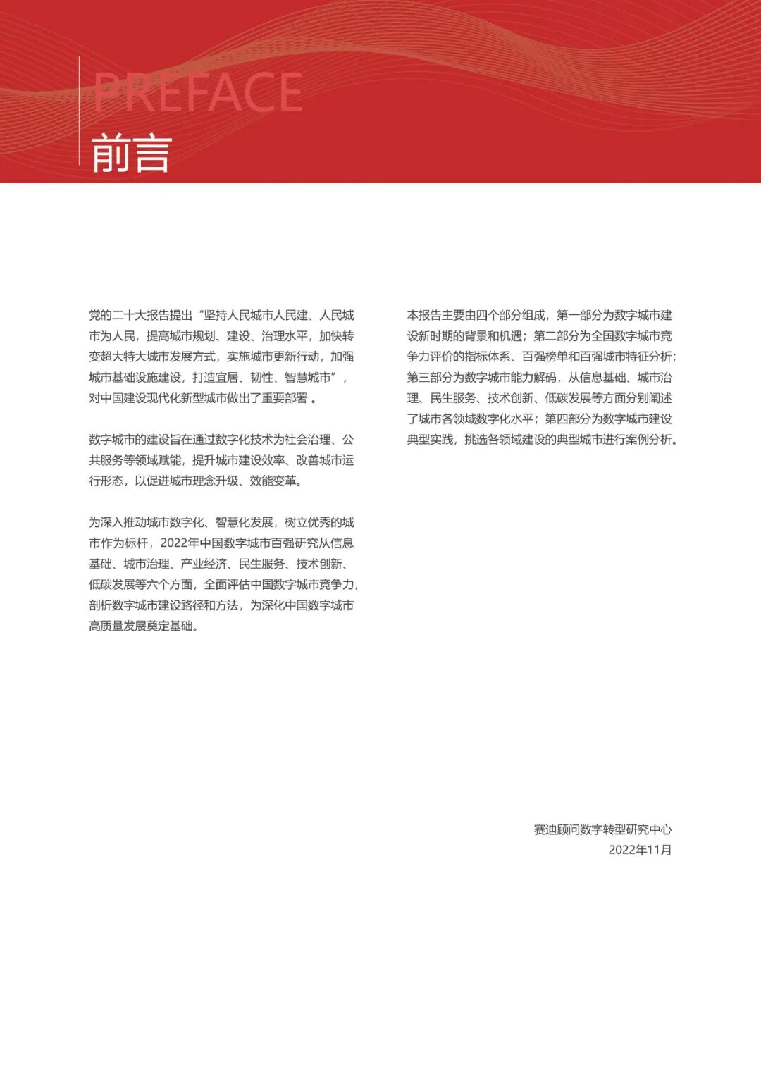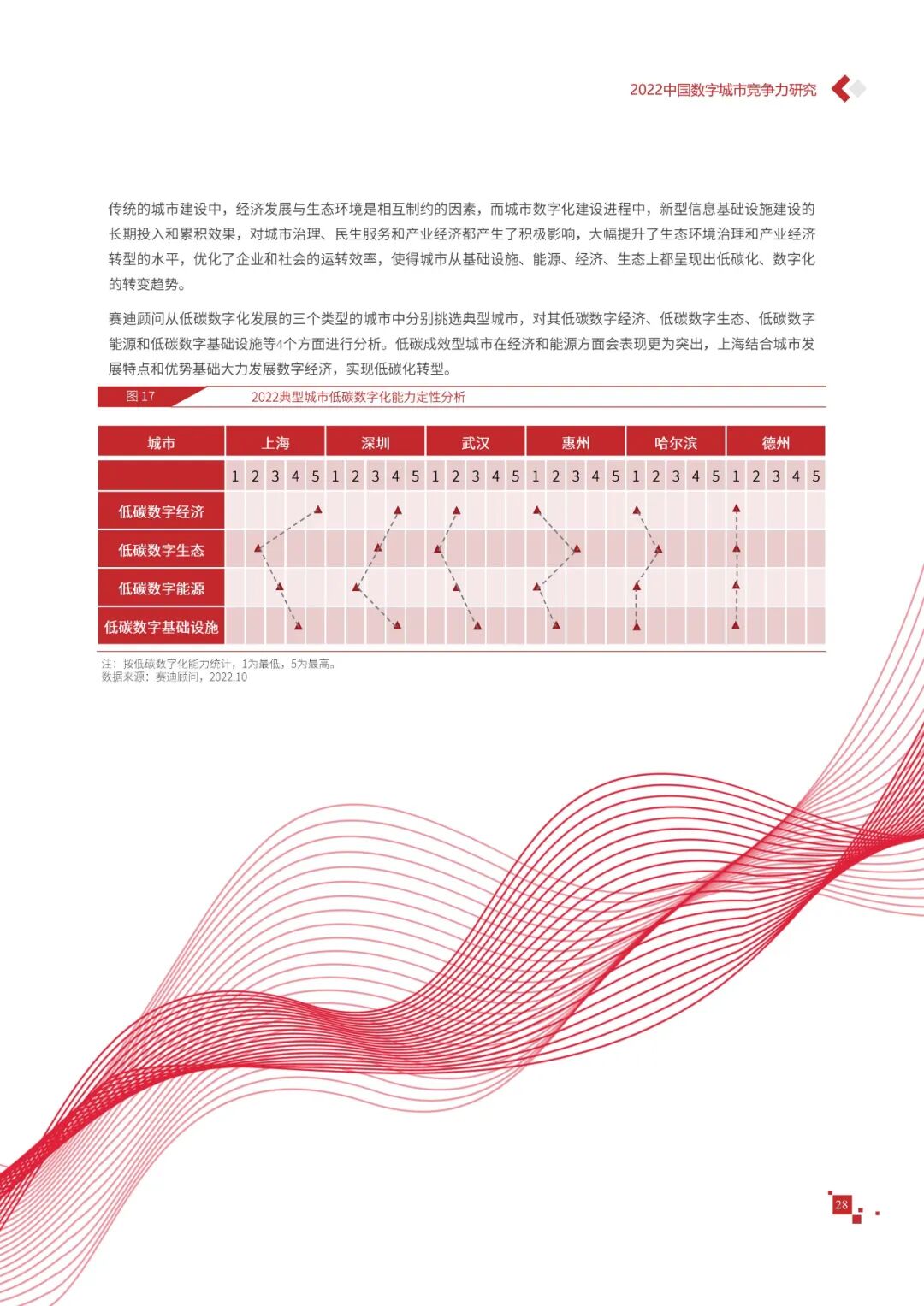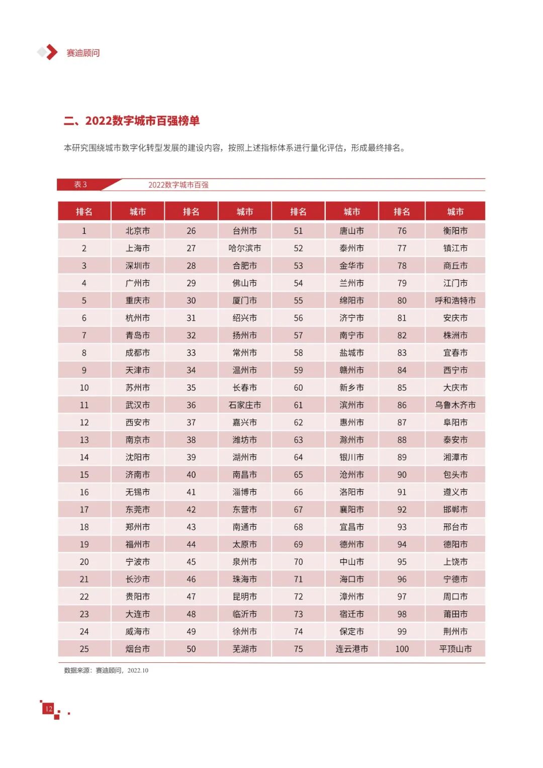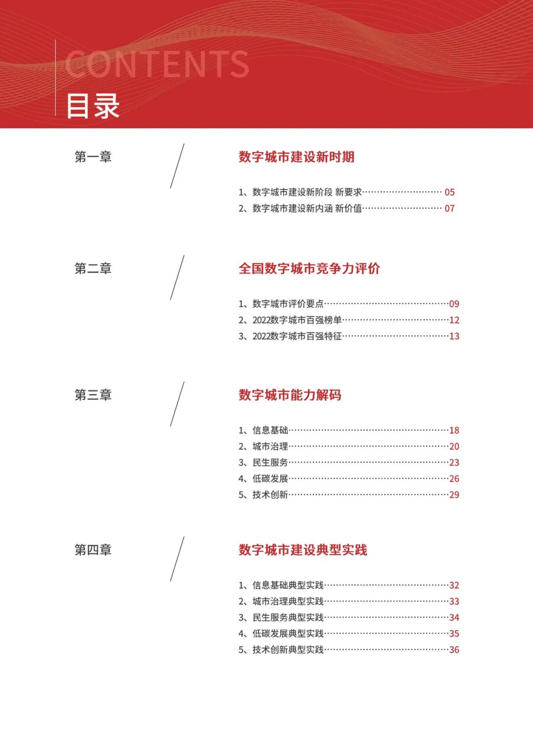 数字城市的建设旨在通过数字化技术为社会治理、公共服务等领域赋能,提升城市建设效率、改善城市运行形态,以促进城市理念升级、效能变革。为深入推动城市数字化、智慧化发展,树立优秀的城市作为标杆,2022年中国数字城市百强研究从信息基础、城市治理、产业经济、民生服务、技术创新、低碳发展等六个方面,全面评估中国数字城市竞争力,剖析数字城市建设路径和方法,为深化中国数字城市高质量发展奠定基础。报告主要由四个部分组成,第一部分为数字城市建设新时期的背景和机遇;第二部分为全国数字城市竞争力评价的指标体系、百强榜单和百强城市特征分析;第三部分为数字城市能力解码,从信息基础、城市治理、民生服务、技术创新、低碳发展等方面分别阐述了城市各领域数字化水平;第四部分为数字城市建设典型实践,挑选各领域建设的典型城市进行案例分析。报告内容如下