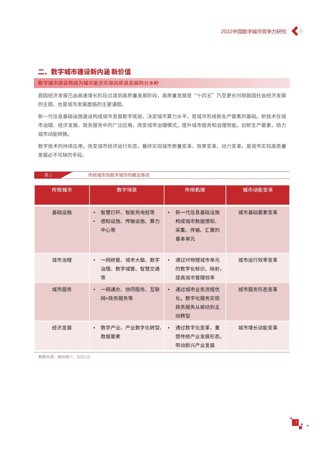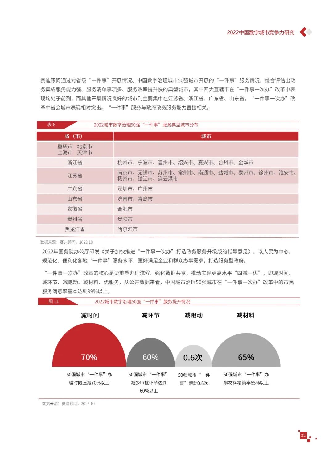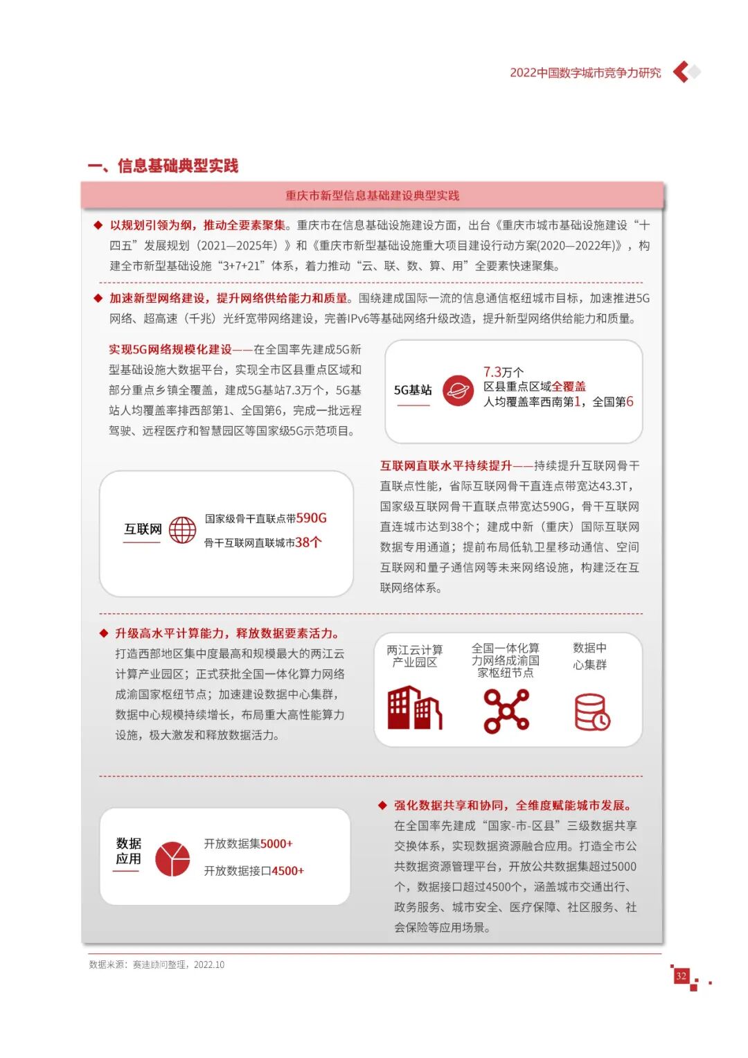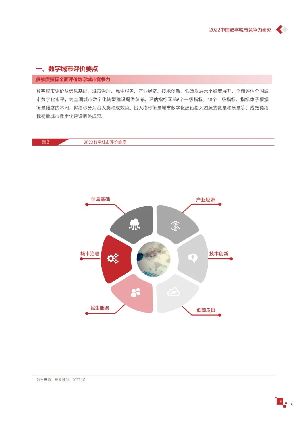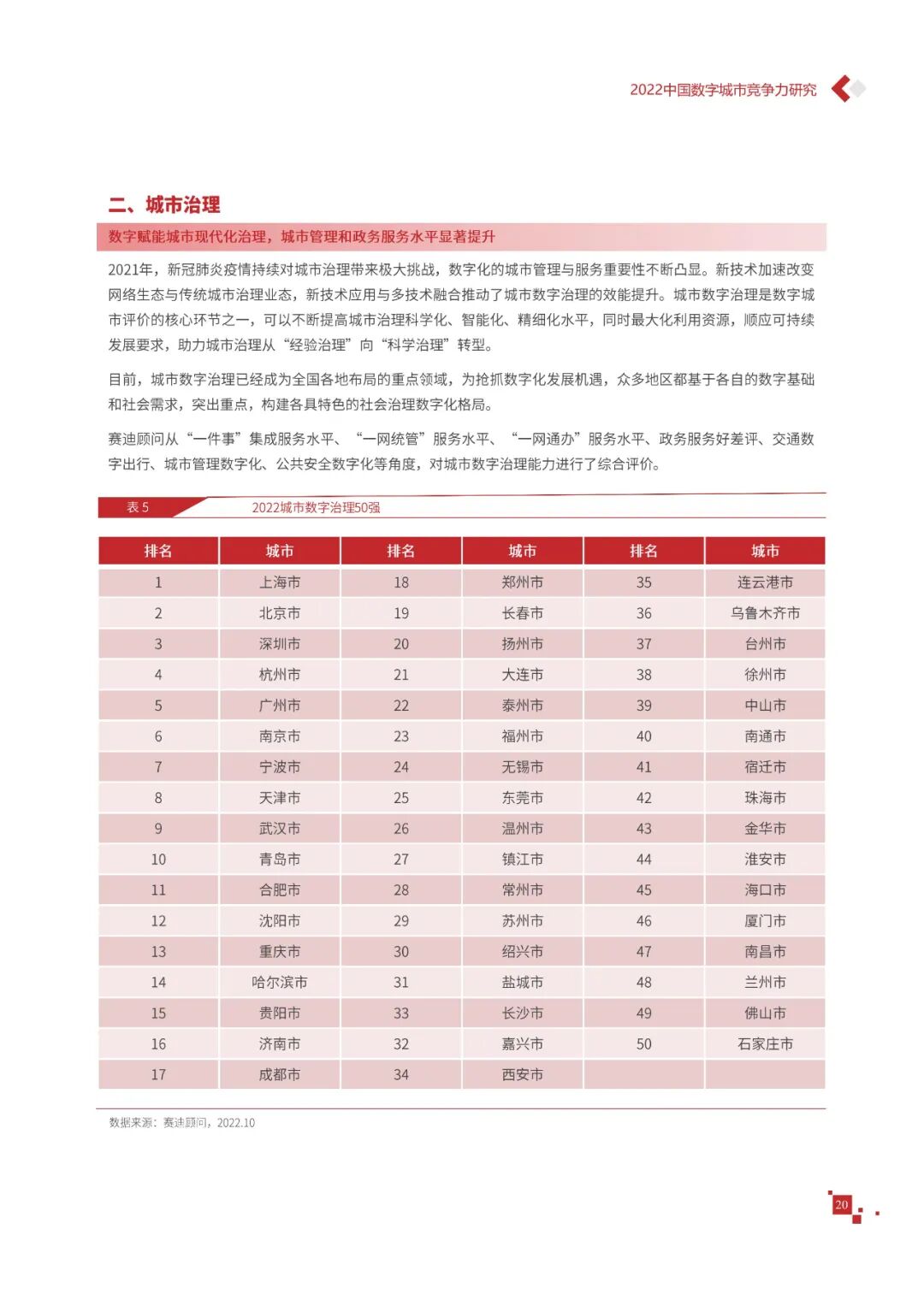 数字城市的建设旨在通过数字化技术为社会治理、公共服务等领域赋能,提升城市建设效率、改善城市运行形态,以促进城市理念升级、效能变革。为深入推动城市数字化、智慧化发展,树立优秀的城市作为标杆,2022年中国数字城市百强研究从信息基础、城市治理、产业经济、民生服务、技术创新、低碳发展等六个方面,全面评估中国数字城市竞争力,剖析数字城市建设路径和方法,为深化中国数字城市高质量发展奠定基础。报告主要由四个部分组成,第一部分为数字城市建设新时期的背景和机遇;第二部分为全国数字城市竞争力评价的指标体系、百强榜单和百强城市特征分析;第三部分为数字城市能力解码,从信息基础、城市治理、民生服务、技术创新、低碳发展等方面分别阐述了城市各领域数字化水平;第四部分为数字城市建设典型实践,挑选各领域建设的典型城市进行案例分析。报告内容如下