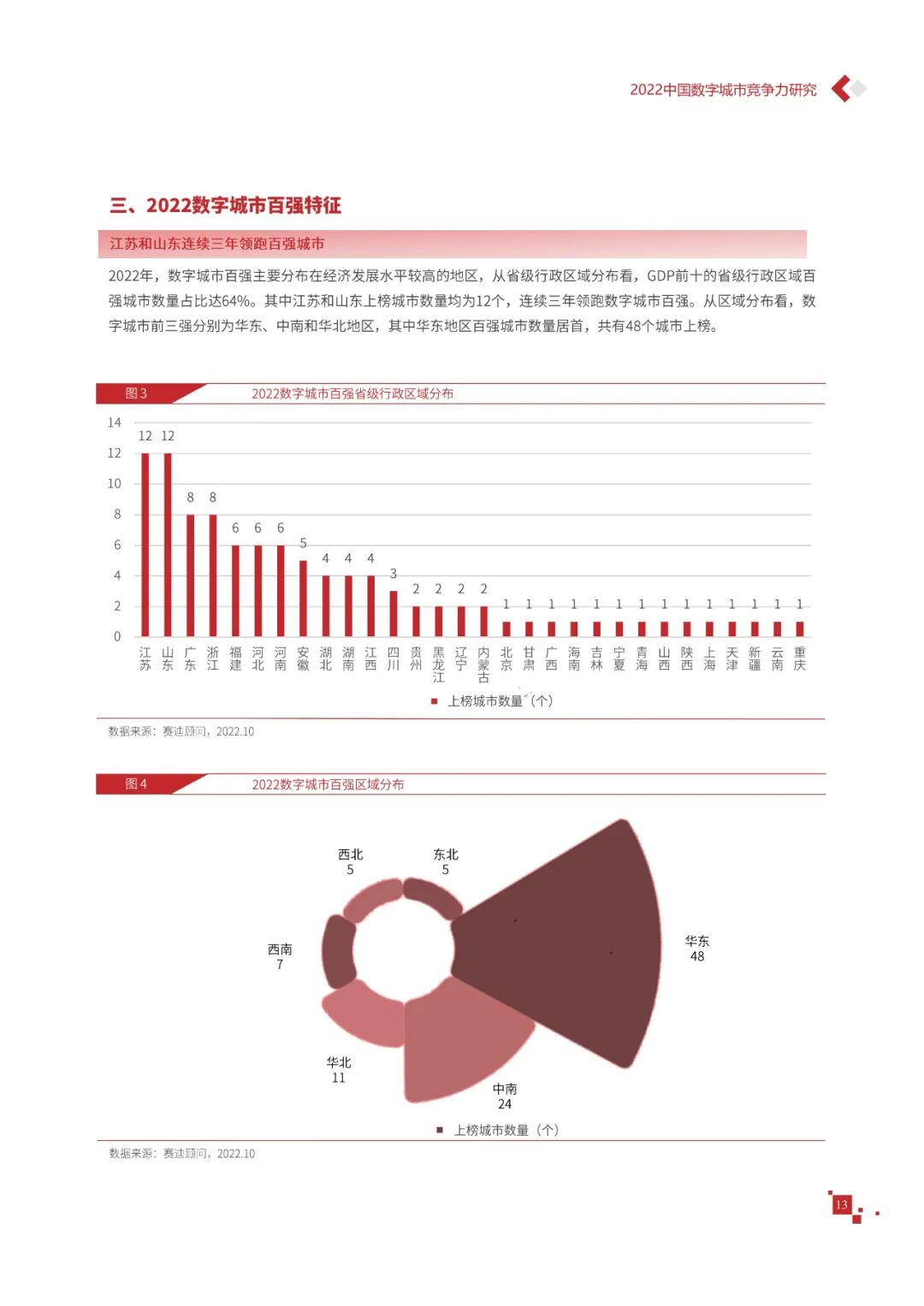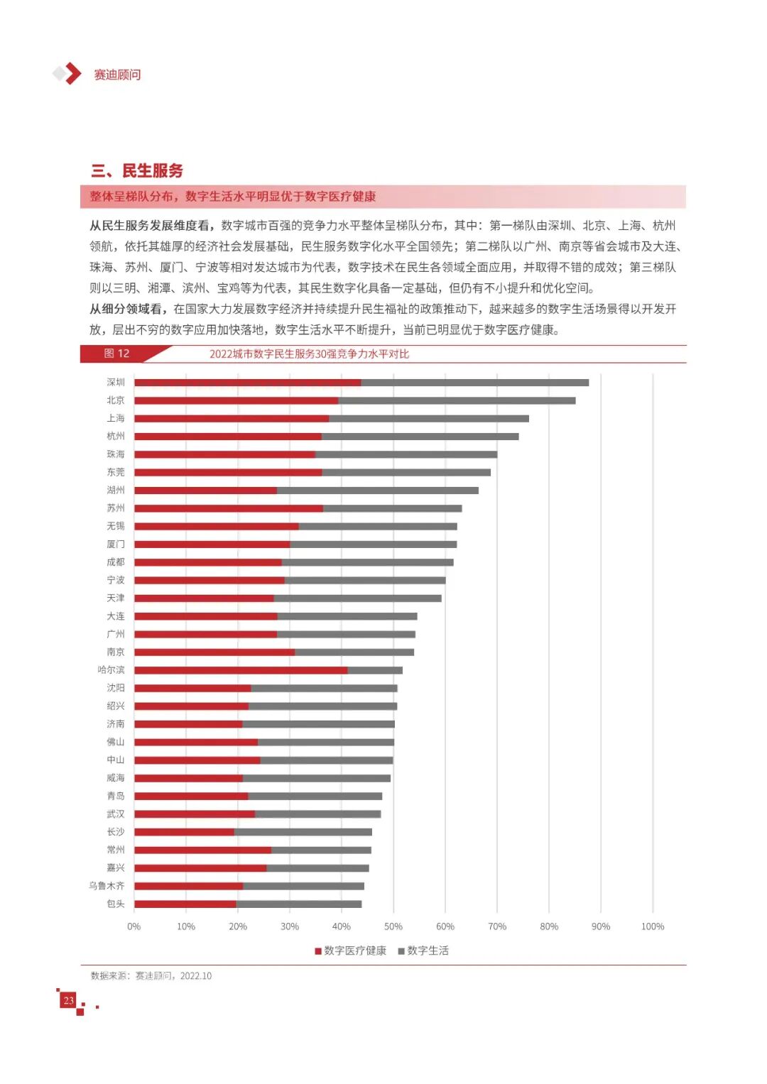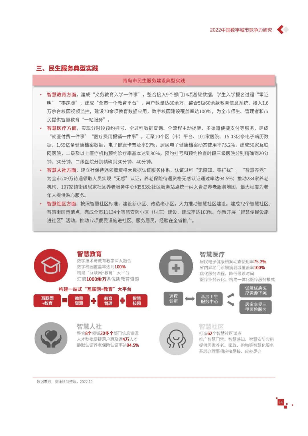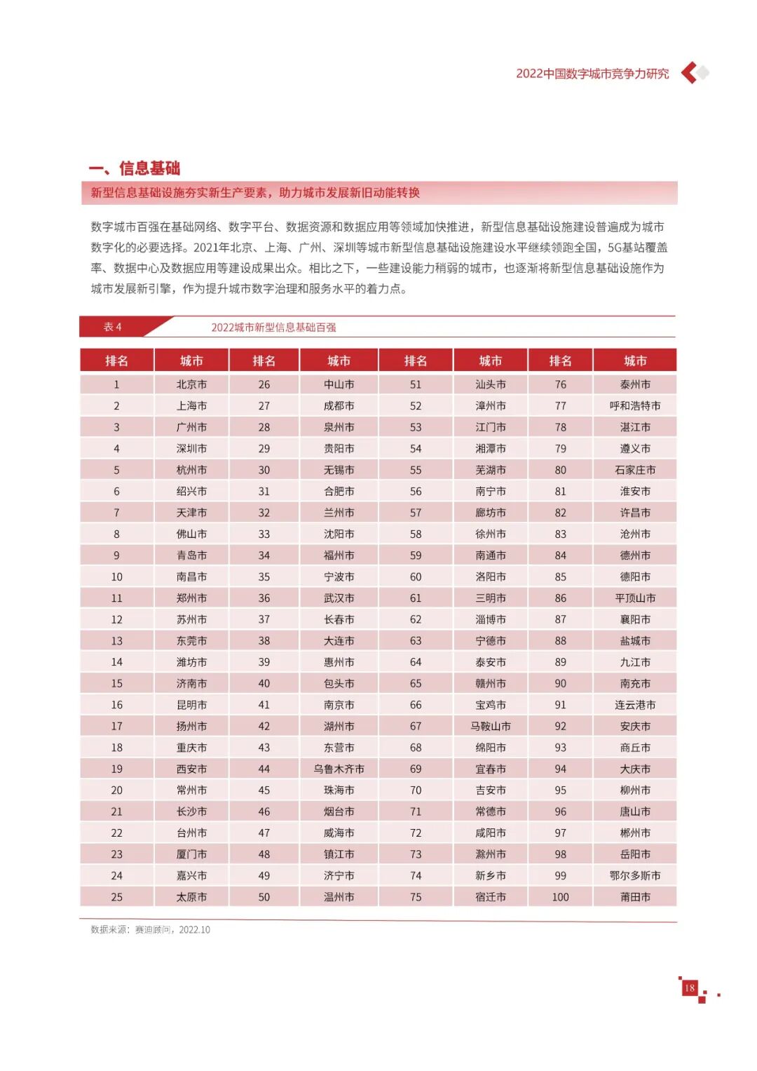 数字城市的建设旨在通过数字化技术为社会治理、公共服务等领域赋能,提升城市建设效率、改善城市运行形态,以促进城市理念升级、效能变革。为深入推动城市数字化、智慧化发展,树立优秀的城市作为标杆,2022年中国数字城市百强研究从信息基础、城市治理、产业经济、民生服务、技术创新、低碳发展等六个方面,全面评估中国数字城市竞争力,剖析数字城市建设路径和方法,为深化中国数字城市高质量发展奠定基础。报告主要由四个部分组成,第一部分为数字城市建设新时期的背景和机遇;第二部分为全国数字城市竞争力评价的指标体系、百强榜单和百强城市特征分析;第三部分为数字城市能力解码,从信息基础、城市治理、民生服务、技术创新、低碳发展等方面分别阐述了城市各领域数字化水平;第四部分为数字城市建设典型实践,挑选各领域建设的典型城市进行案例分析。报告内容如下