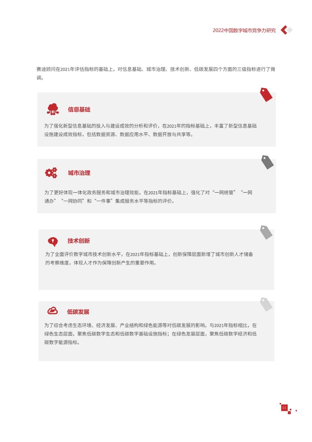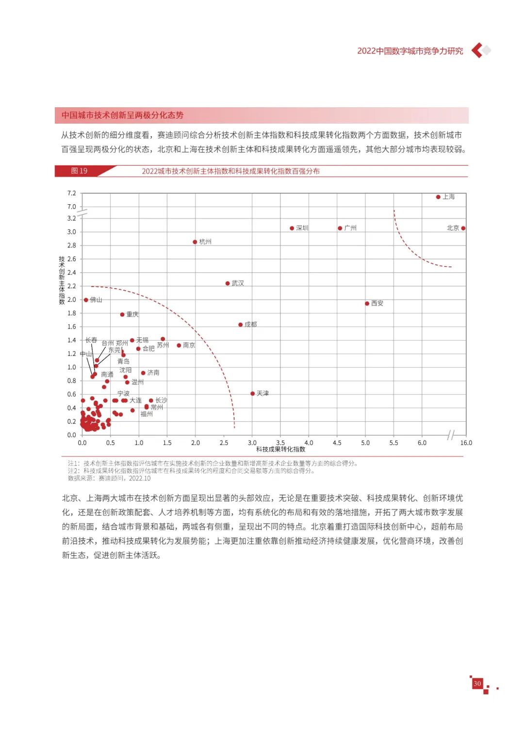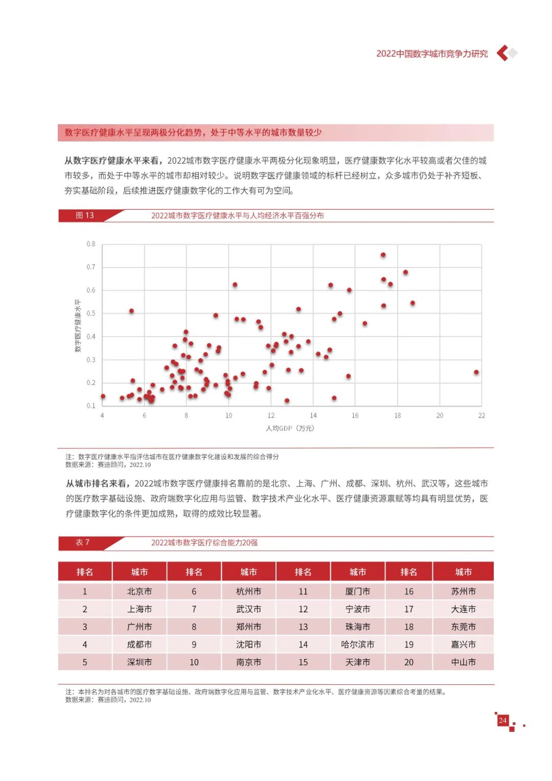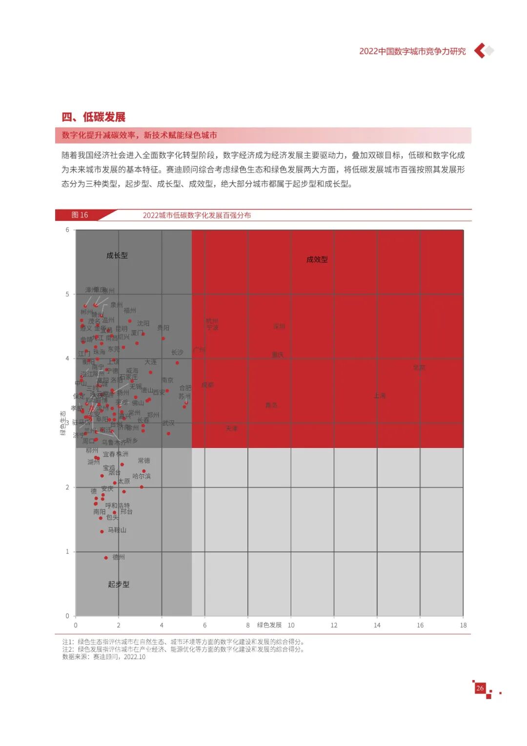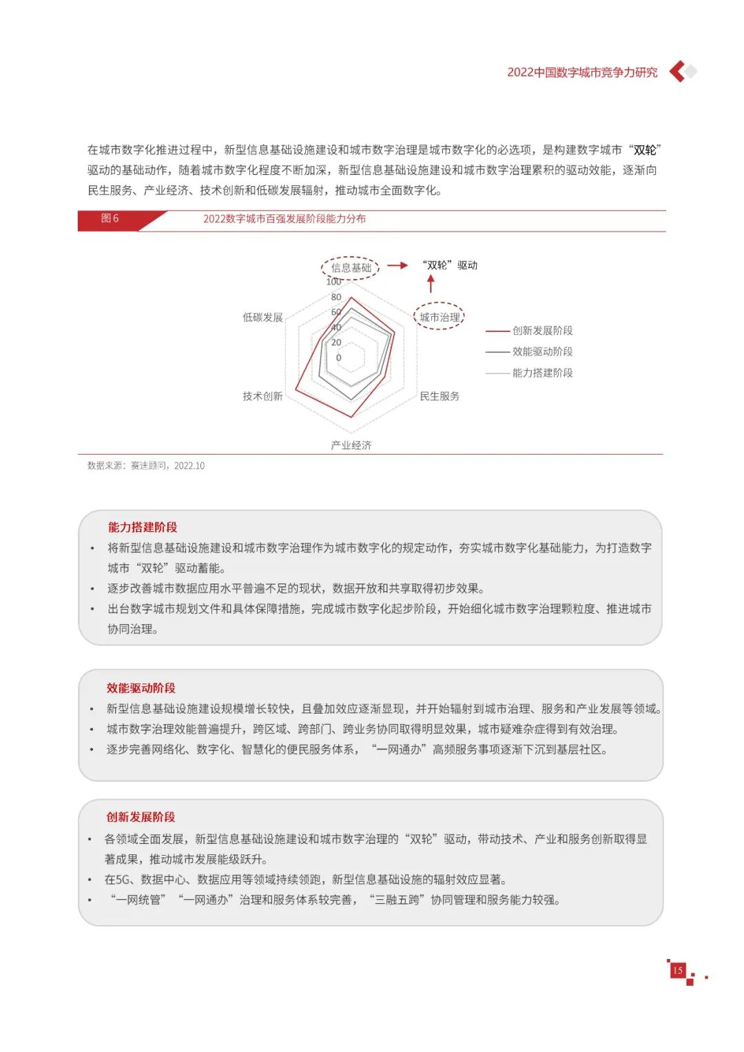 数字城市的建设旨在通过数字化技术为社会治理、公共服务等领域赋能,提升城市建设效率、改善城市运行形态,以促进城市理念升级、效能变革。为深入推动城市数字化、智慧化发展,树立优秀的城市作为标杆,2022年中国数字城市百强研究从信息基础、城市治理、产业经济、民生服务、技术创新、低碳发展等六个方面,全面评估中国数字城市竞争力,剖析数字城市建设路径和方法,为深化中国数字城市高质量发展奠定基础。报告主要由四个部分组成,第一部分为数字城市建设新时期的背景和机遇;第二部分为全国数字城市竞争力评价的指标体系、百强榜单和百强城市特征分析;第三部分为数字城市能力解码,从信息基础、城市治理、民生服务、技术创新、低碳发展等方面分别阐述了城市各领域数字化水平;第四部分为数字城市建设典型实践,挑选各领域建设的典型城市进行案例分析。报告内容如下